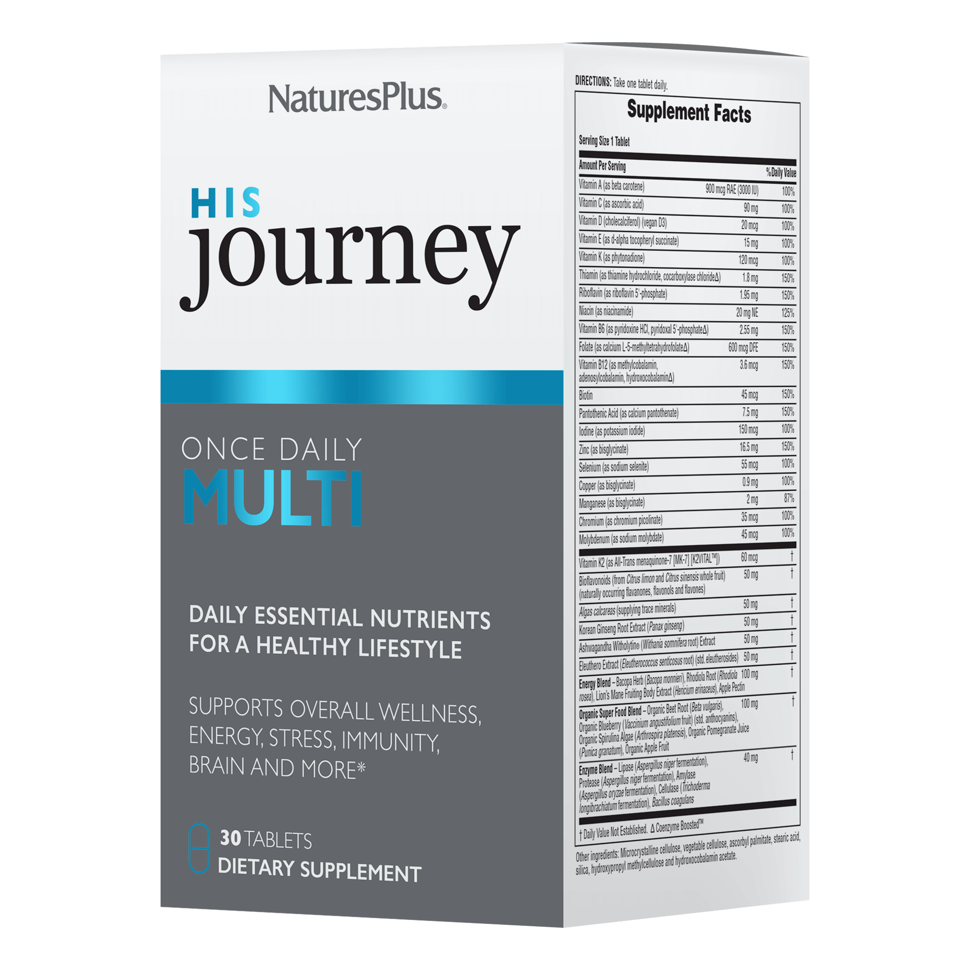 Life is an adventure—and His Journey is a once-daily multivitamin designed to power men through life’s demands. With complete daily nutrition, energy-boosting B vitamins, gut-friendly enzymes and probiotics, and stress-fighting adaptogens, it’s everything you need—in one tablet.*
