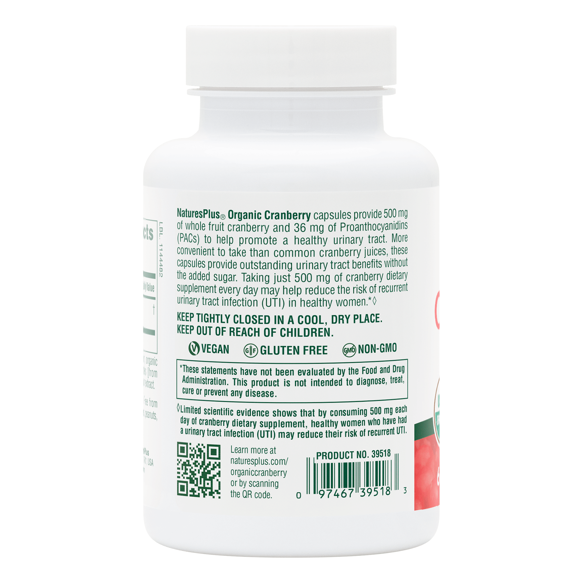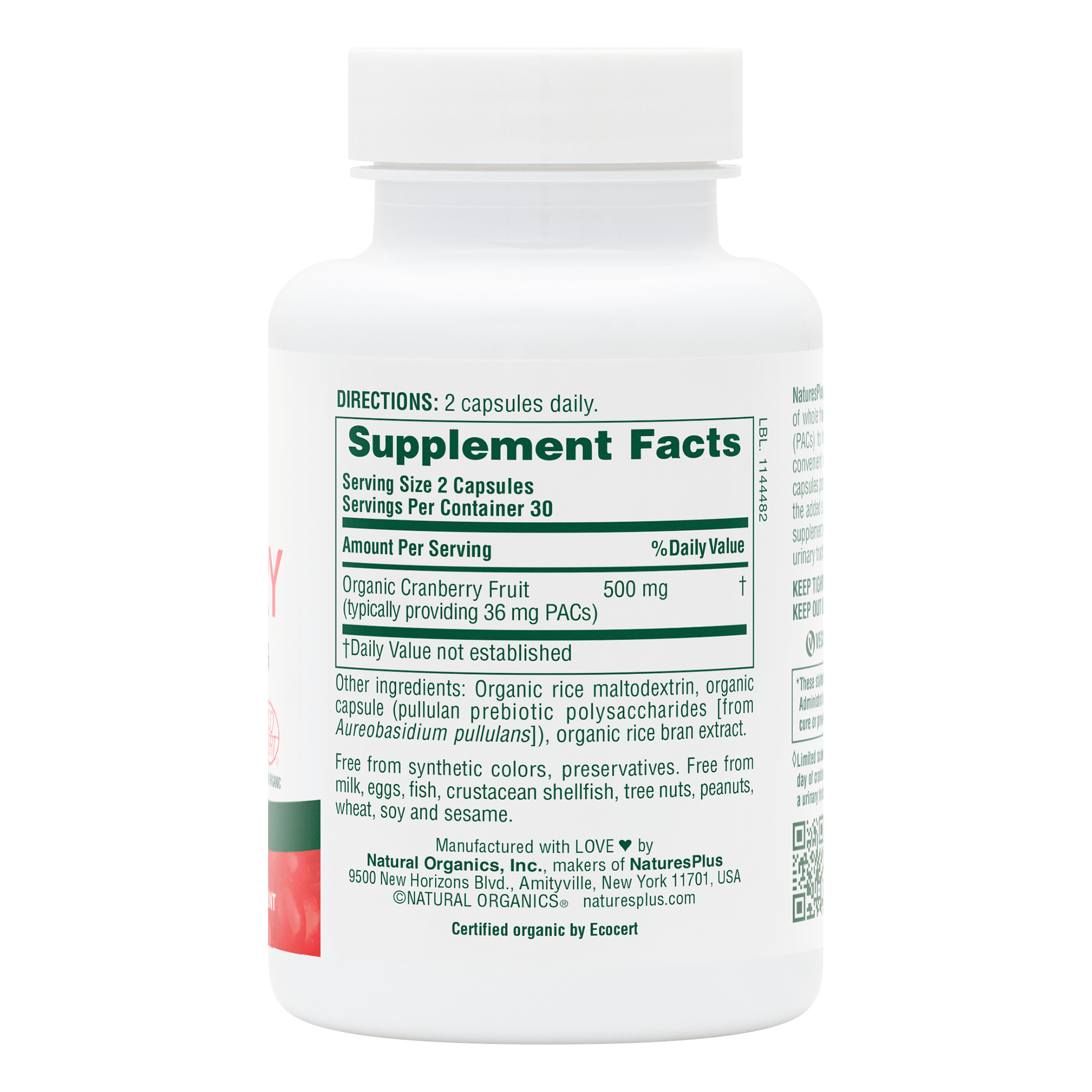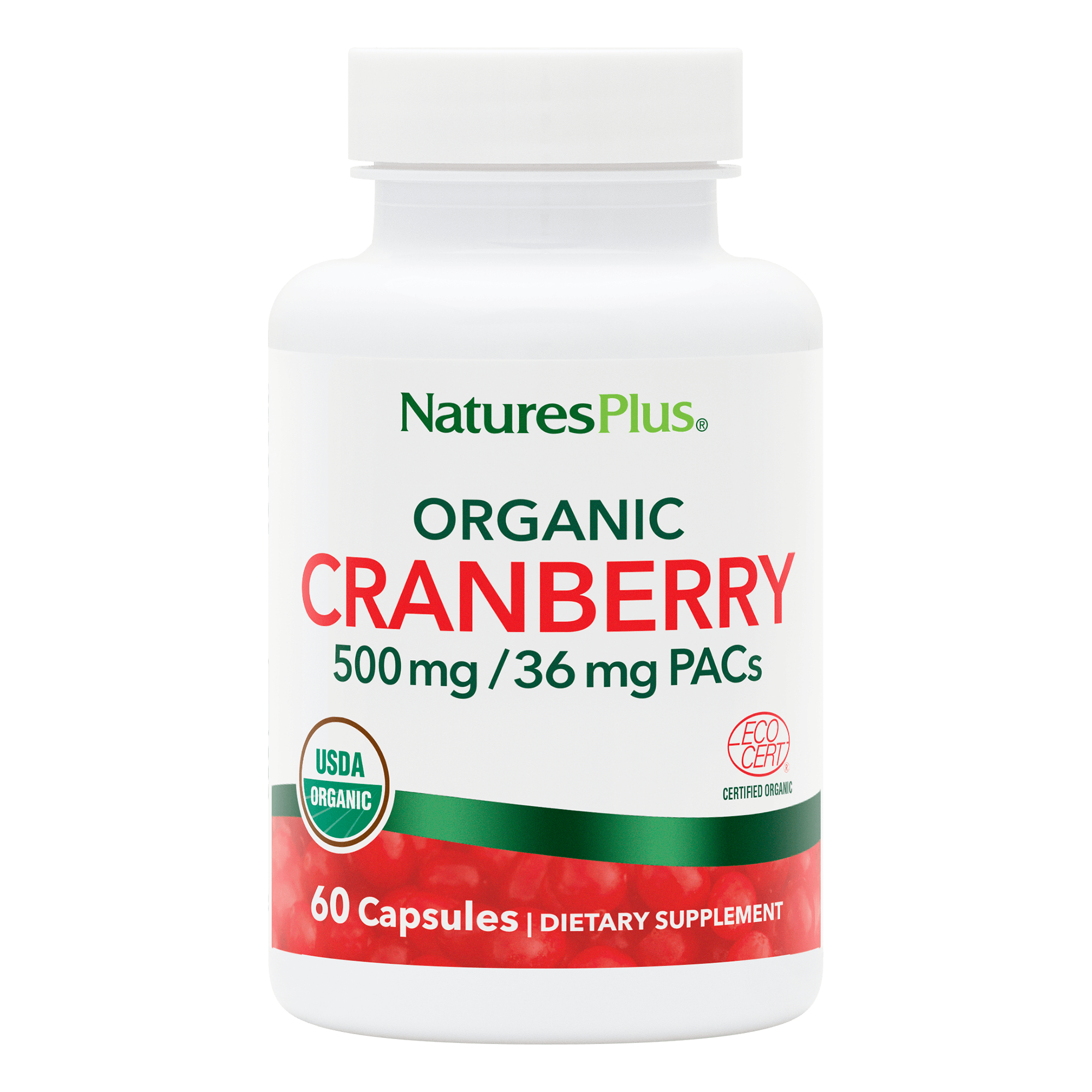 NaturesPlus Organic Cranberry 500 supports urinary tract health with 500 mg of dual-certified organic cranberry and 36 mg of PACs.*
